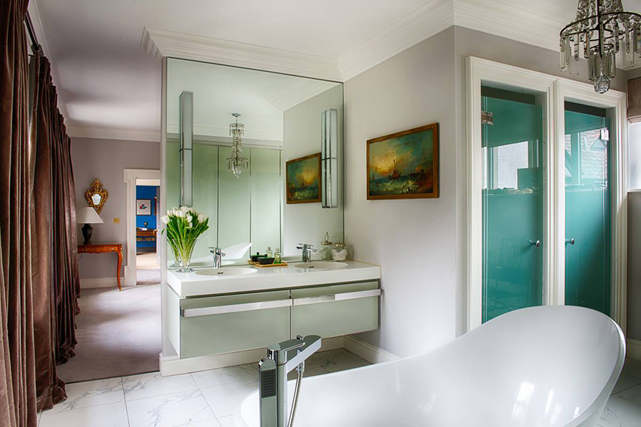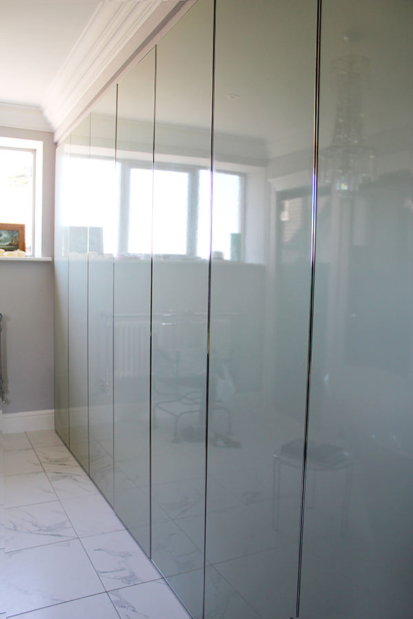 A full length wall with a custom made wardrobe. The internals are made to the exact spec of the customer and the doors are no different here. The customer wanted a clean simple detail on the doors. We made it with a 5mm trim in mirror polished stainless steel on a gloss lacquered door. The trim is mirrored on the bathroom cabinet we made too, with a white corian top.