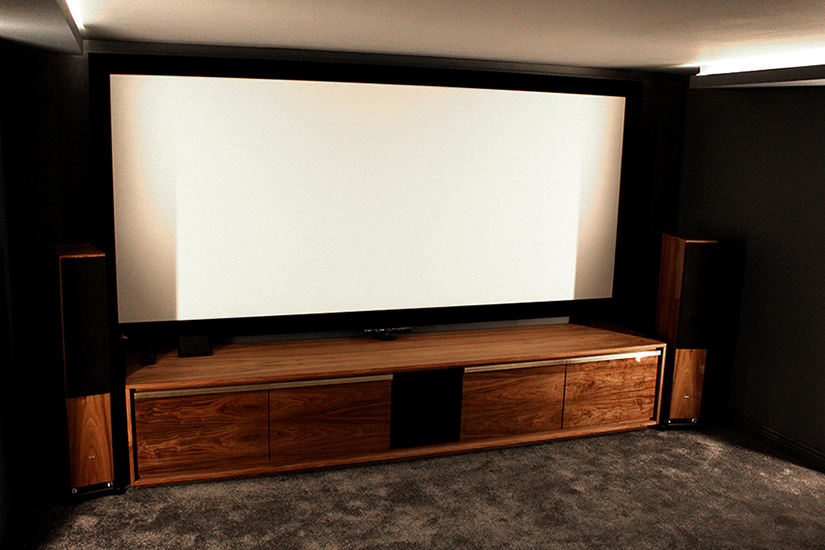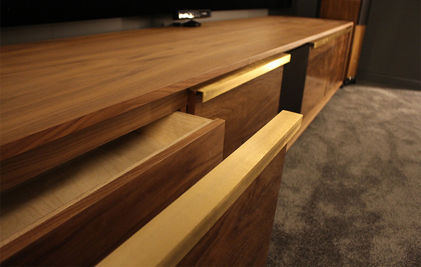 The top and side of our unit was done in a dead matt so the reflection would be zero with the screen above. We used a wet look lacquer on the drawer fronts to match in with the speakers. All the handles are brass and we used a very coarse grit to polish them to give a really nice brushed effect.