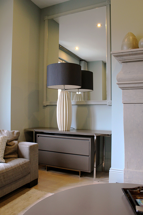 Each alcove has a custom made cabinet and side table. As they are made to order, they fit the space exactly. The finish is a matt lacquer and the frames on the side tables are made from mirror polished stainless steel.